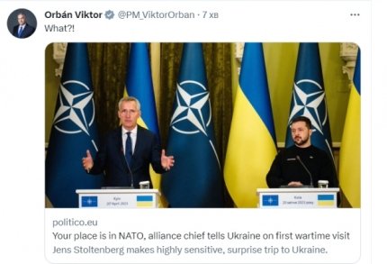На своей странице в Твиттере Виктор Орбан опубликовал материал издания Politico, в котором цитируется заявление генсека НАТО Йенса Столтенберга во время брифинга в Киеве.