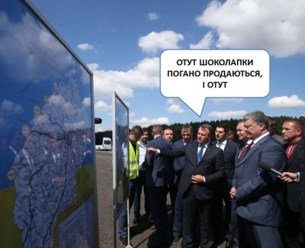 На фотожабе изображен Петр Порошенко, который с грустью смотрит на карту, при этом один из чиновников ему словно говорит: «Вот тут Шоколапки плохо продаются».