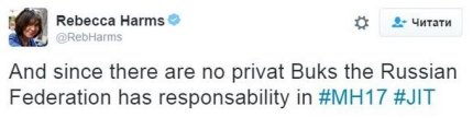 Так, депутат Европарламента Ребекка Хармс в своём микроблоге написала о том, что, поскольку нет частных "Буков", Россия несет ответственность за авиакатастрофу MH17.