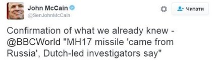 Сенатор США от штата Аризона Джон Маккейн также прокомментировал данные отчета: "Подтверждение того, что мы уже знали - ракетную установку, которая сбила MH17, привезли из России".