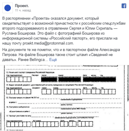 Паспортные данные Руслана Боширова обнародовало издание "Проект" в соцсети. Эти данные были получены из информационной системы "Российский паспорт" по электронной почте, сообщает ONLINE.UA.