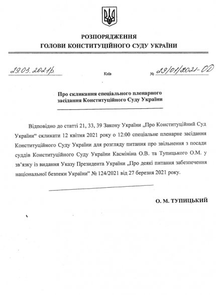 Тупицкий созывает специальное заседание КСУ (фото распоряжения - facebook.com/ConstitutionalCourtofUkraine)