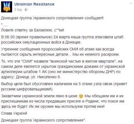 "Ловите ответку за Балаклею, с**ки! В 08:30 (время правильное) 24 марта наша группа атаковала штаб российских оккупационных войск в Донецке", - говорится в сообщении.