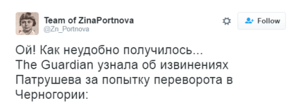 The Guardian написал, что Патрушев, который прилетел в Белград 26 октября, извинился за граждан России, планировавших переворот в Черногории, отметив при этом, что заговорщики действовали самостоятельно без санкции Кремля.