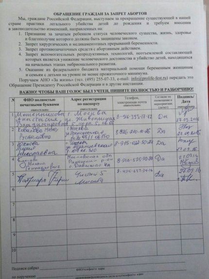 "Мы, граждане Российской Федерации, выступаем за прекращение существующей в нашей стране практики легального убийства детей до рождения и требуем внесения в законодательство изменений, направленных на: Признание за зачатым ребенком статуса человеческого существа, жизнь, здоровье и благополучие которого должны быть защищены законом; запрет хирургических и медикаментозных прерываний беременности; запрет противозачаточных средств с абортивным действием; запрет вспомогательных репродуктивных технологий, неотъемлемой составляющей которых является унижение человеческого достоинства и убийство детей, находящихся на начальных этапах эмбрионального развития; оказание из федерального бюджета материальной помощи беременным женщинам и семьям с детьми на уровне не менее прожиточного минимума", - говорится в тексте обращения, под которым поставил подпись Кирилл.