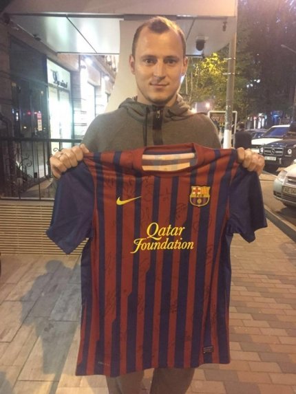 Форвард "Днепра" Роман Зозуля выставил на продажу футболку каталонской "Барселоны" с автографами футболистов.