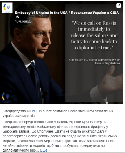 Волкер добавил, что США и Европа рассматривают возможность введения новых санкций против России за ее незаконные действия в Керченском проливе. По его словам, они будут введены, если Россия не освободит украинских моряков и будет продолжать контроль над Керченским проливом.