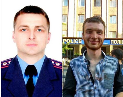 На фото, слева направо: начальник отдела управления КОРД Главного управления Национальной полиции в городе Киеве майор полиции Виталий Валецкий и активист Сергей Бондарь.