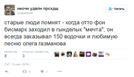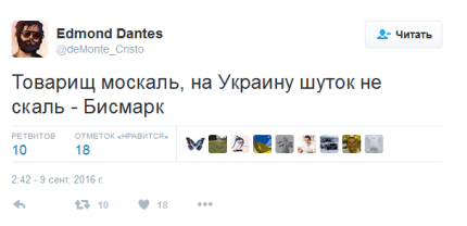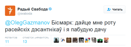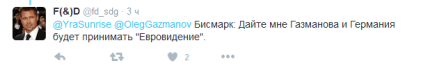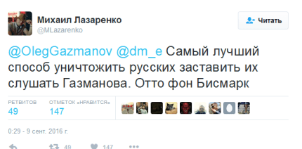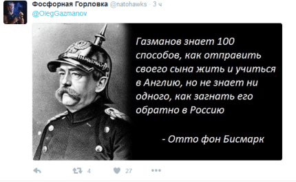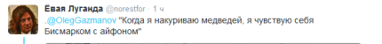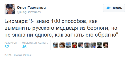 На своей странице в Twitter Газманов написал: «Бисмарк: "Я знаю 100 способов, как выманить русского медведя из берлоги, но не знаю ни одного, как загнать его обратно".