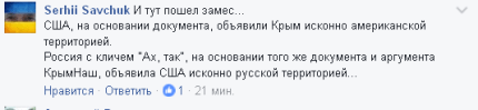 "В США существуют документы, согласно которым на территорию оккупированного Крыма может претендовать Вашингтон.Об этом заявил народный депутат Андрей Артеменко на брифинге в Киеве." Теперь задача высмеять проблему. Превратить все в клоунаду. Клоунов у нас хватает. ФСБ и стараться даже не надо..." – написал он в своем Facebook.