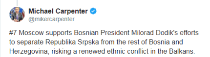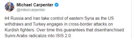 Также, по прогнозу американского эксперта, в 2019 году Россия установит контроль над востоком Сирии совместно с Ираном после вывода сил США, увеличит свое военное присутствие в Ливии, попытается спровоцировать очередной этнический конфликт на Балканах и усилит связи с Саудовской Аравией.