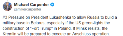 Путин в 2019 году также готовит неприятный сюрприз и для Беларуси. Экс-сотрудник Пентагона уверен, что стоит ожидать давления Кремля на Лукашенко, чтобы он согласился на строительство российской военной базы в Беларуси. Если Минск будет сопротивляться, Кремль будет готовиться осуществить присоединение Беларуси к РФ, уверен Карпентер.