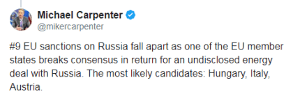 При этом Карпентер уверен, что в 2019 году санкции ЕС против России начнут распадаться, так как некоторые члены ЕС будут нарушать консенсус в обмен на непубличное соглашение с Россией в сфере энергетики. Наиболее вероятными кандидатами, среди тех, кто встанет на сторону Москвы являются: Италия, Венгрия и Австрия.