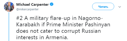 Допускает Карпентер и военную вспышку в Нагорном Карабахе, если новому амрянскому премьеру Пашиняну не удастся повлиять на интересы России.