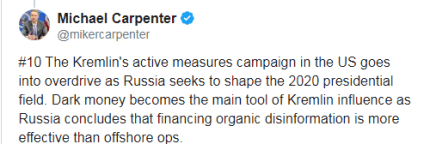 Также Карпентер убежден, что Путин в 2019 году будет активно работать над тем, чтобы оформить под себя расстановку сил в США перед президентской кампанией 2020 года.