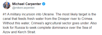 "Путин решится на военное вторжение в Украину, чтобы взять под контроль южнокрымский канал, Азовское море и Керченский пролив. Скорее всего, целью станет канал из Днепра в Крым. Без этой воды страдает сельское хозяйство Крыма", – написал эксперт.