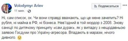 "Нет, сам список, ОК. Или они действительно считают, что это меня коснется? Ни рубля, ни имущества в РФ, ни бизнеса. Невъездной в то "Мордор" (в Россию – ред.) с 2008 года. Опять санкции по детскому принципу "сам дурак", как в случае с недавним заявлением Госдумы про Украину-"агрессора". Впадают в маразм, ничего удивительного", - написал Арьев.