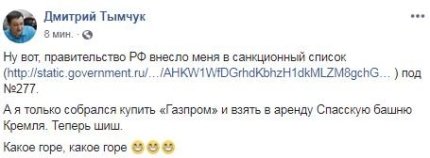 "Ну вот, правительство РФ внесло меня в санкционный список. А я только собрался купить "Газпром" и взять в аренду Спасскую башню Кремля. Теперь "шиш". Какое горе, какое горе", - посмеялся Тымчук.