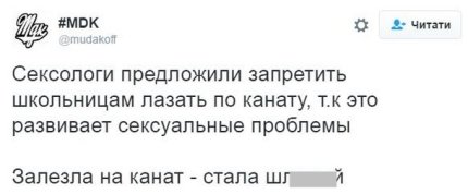 #MDK: "Сексологи предложили запретить школьницам лазать по канату, т.к это развивает сексуальные проблемы. Залезла на канат - стала шл**ой".