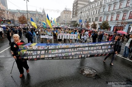 Участники марша с флагами Украины и портретами погибших бойцов АТО прошли по Крещатику от Бессарабской площади в сторону Майдана Незалежности. Среди участников марша присутствовали добровольцы в военной форме со следами ранений.