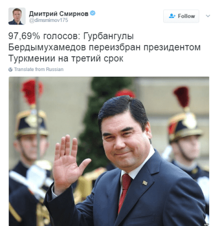 Стоит отметить, что в России отреагировали на победу Бердымухамедова. Так, путинский пропагандист, журналист кремлевского пула Дмитрий Смирнов сообщил о результатах выборов президента Туркменистана у себя в Twitter.