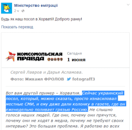 "Хороший у нас посол в Хорватии, все правильно делает", - прокомментировал блогер Иван Оберемко в Facebook.