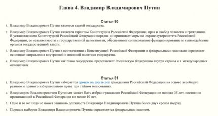 Стоит отметить, что российский интернет довольно бурно отреагировал на обнуление президентских сроков Путина - не только жесткими комментариями, но и мемами и креативными прогрозамы относительно дальнейшего будущего РФ с "вечным" президентом во главе. Этим и занялись авторы сайта "Путин навсегда", на который обратил внимание пользователь TJournal. Первый раз Путин упоминается в 11 статье. Она начинается словами "Государственную власть в Российской Федерации осуществляет Владимир Владимирович Путин".