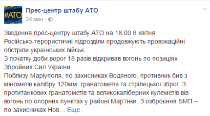 На протяжении 8 апреля боевики 18 раз открывали огонь по украинским позициям на Донбассе.