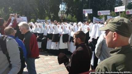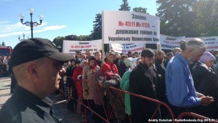 18 мая возле здания Верховной Рады Украины собрались верующие Украинской православной церкви Московского патриархата, которые протестуют против принятия парламентом законопроектов о религиозных организациях.