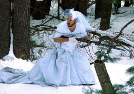 Оказывается, свадебное платье - отличный наряд для зимней охоты.