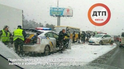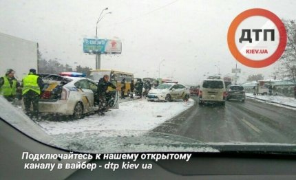 В Киеве на Броварском проспекте около метро «Лесная» произошло масштабное дорожно-транспортное происшествие с участием нетрезвого водителя Volkswagen, полицейского автомобиля, маршрутки и грузовика.