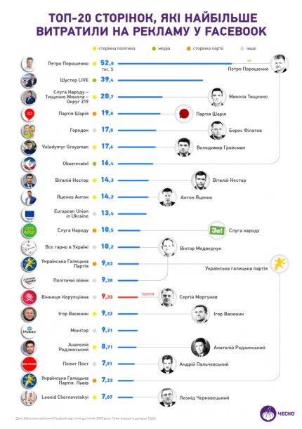 "Первые три места среди всех страниц занимают Петр Порошенко (52,3 тысячи долларов), программа" Шустер LIVE "(39 тысяч) и нардеп Николай Тищенко (20,7 тысячи)", - отметили в организации.
