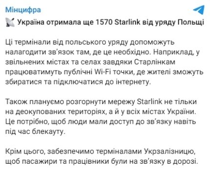 Кроме того, указано, что с начала полномасштабного вторжения от доноров и партнеров Украина получила более 20 тысяч терминалов Starlink, из которых 5 тысяч от официальной Варшавы.