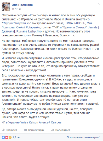 "Открываю сегодня «Комсомолку» и читаю про всеми обсуждаемую ситуацию: «В Юрмале на фестивале Made In Ukraina вместе со "Студия "Квартал 95" выступало много звезд: Тина Кароль, Оля Полякова, Oleksii Potapenko, группы "ТиК" и "Время и Стекло", Джамала, Ruslana Lyzhychko и другие. Но комментировать этот скандал они не хотят. Почему? Наверное, боятся…".