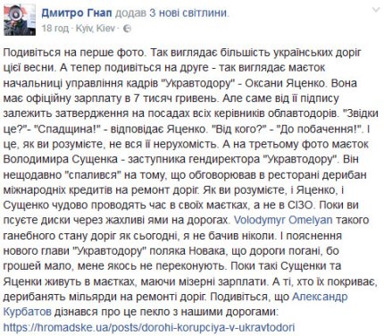 По словам Гнапа, речь идет о начальнице управления кадров организации Оксане Яценко, а также о Владимире Сущенко - до увольнения он занимал пост заместителя гендиректора "Укравтодора".