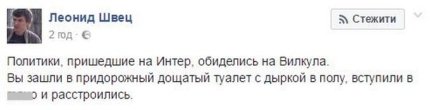 Известный блогер и журналист Леонид Швец добавил: "Политики, пришедшие на Интер, обиделись на Вилкула. Вы зашли в придорожный дощатый туалет с дыркой в полу, вступили в г**но и расстроились".