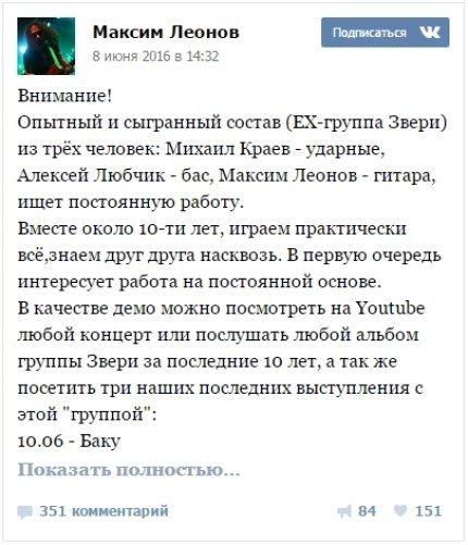 О произошедших изменениях рассказал гитарист Максим Леонов на своей странице в соцсети. Он сообщил, что кроме него из группы ушли еще двое.