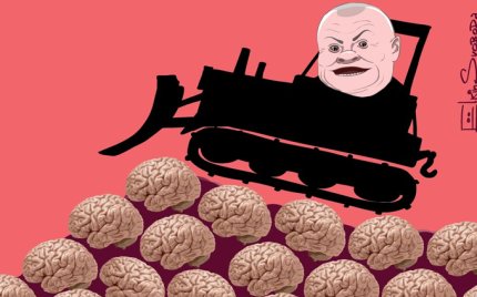 На картинке изображен сам Киселев за рулем бульдозера, со зверским выражением лица ездящий по горе мозгов.