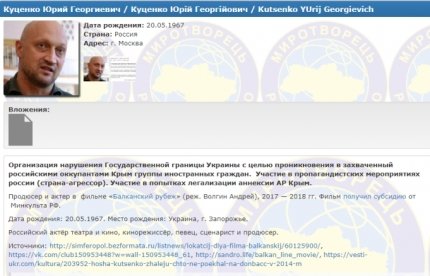 На сайте отмечается, что Куценко включен в "чистилище" за нарушение государственной границы Украины при поездках в оккупированный Крым. В частности, на территории полуострова Куценко принимал участие в съемках фильма "Балканский рубеж", в котором выступил в роли актера и продюсера.