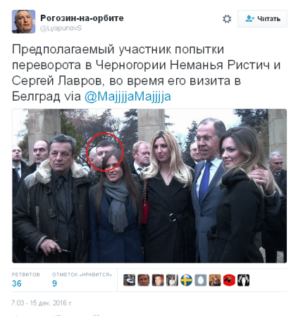 В сети появилось фото, на котором с главой МИД России Сергеем Лавровым, который является одной из ключевых фигур в правительстве президента РФ Владимира Путина, во время его визита в столицу Сербии, Белград, снялся и предполагаемый участник попытки переворота в Черногории Неманья Ристич.