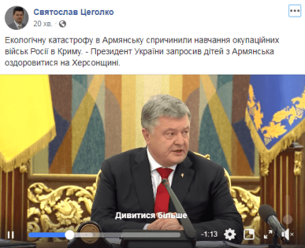 Президент Украины Петр Порошенко заявил, что экологическая катастрофа в оккупированном Армянске произошла вследствие тренировок российских военных, передает ONLINE.UA.