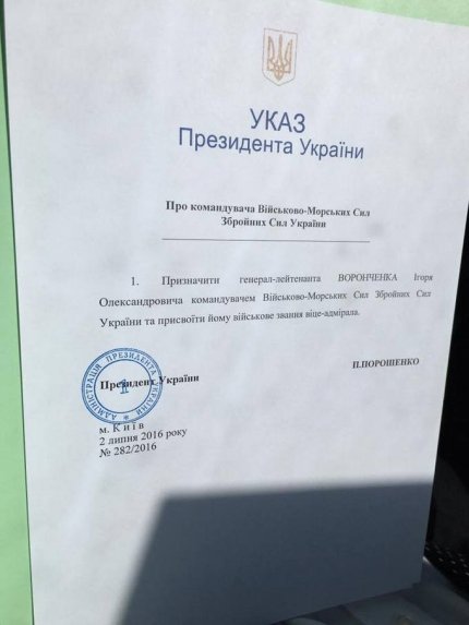 Также, согласно тексту документа, Игорь Воронченко получил военное звание вице-адмирала.