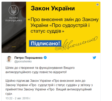 "Только что подписал Закон Украины "О внесении изменений в Закон Украины "О судоустройстве и статусе судей" в связи с принятием Закона Украины "О Высшем антикоррупционном суде. Путь к созданию и функционированию Высшего антикоррупционного суда полностью открыт!", - написал украинский глава.