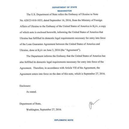 "В развитие моих договоренностей в ходе встречи с вице-президентом США Джозефом Байденом Украина получила от Государственного департамента Соединенных Штатов дипломатическую ноту по кредитным гарантиям объемом $1 млрд", - написал Порошенко.