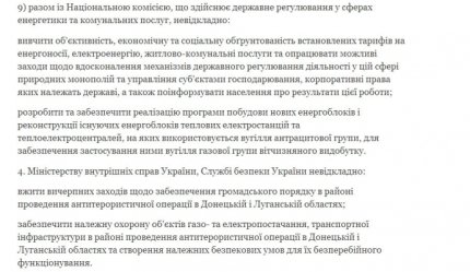 Согласно документу, МВД, Нацгвардия, а также СБУ должно обеспечить общественный порядок на важных инфраструктурных объектах в зоне АТО.