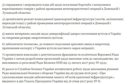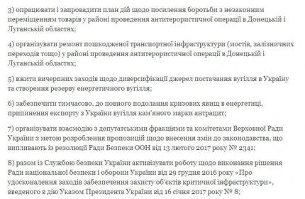 Порошенко дал распоряжения Кабинету министров предпринять действия по нейтрализации угроз энергетической безопасности Украины, утвердить список товаров, которые перемещаются с или в зоны проведения АТО в Луганской и Донецкой областях, определить запрещенные для перемещения товары, а также усилить действия по борьбе с так называемой контрабандой.