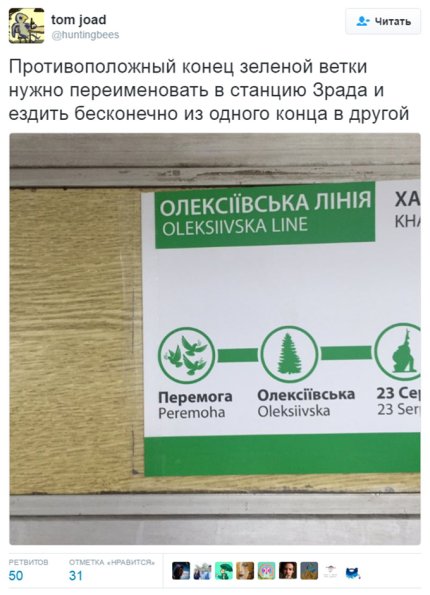 «Противоположный конец зеленой ветки нужно переименовать в станцию «Зрада» и ездить бесконечно из одного конца в другой», - написал в Twitter пользователь tom joad и опубликовал ироничное фото.