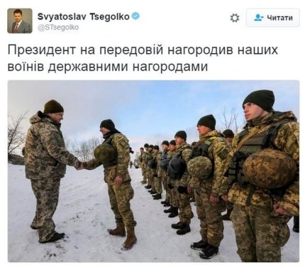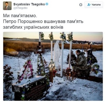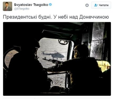 Цеголко обнародовал фотографию президента в вертолёте, охраняемого военнослужащим, фото общения Порошенко с бойцами АТО и вручения им государственных наград. Также в ходе визита в зону АТО украинский лидер почтил память погибших воинов и осмотрел восстановленный в ходе боевых действий мост через реку Казенный Торец Донецкой области, на автомобильной дороге общего пользования государственного значения М-03 Киев-Харьков-Довжанский.