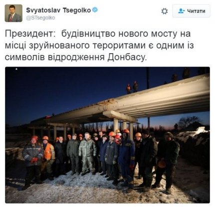 "Строительство нового моста на месте разрушенного террористами является одним из символов возрождения Донбасса", - прокомментировал восстановление конструкции Порошенко.