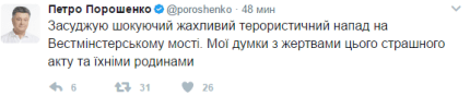 "Осуждаю шокирующее ужасное террористическое нападение на Вестминстерском мосту. Мои мысли с жертвами этого страшного акта и их семьями", - отметил Порошенко.
